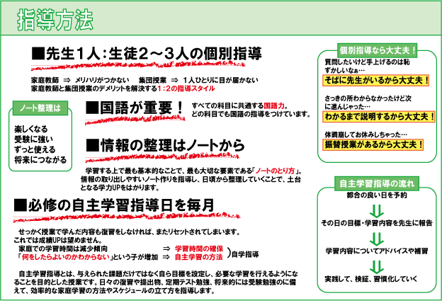 人生は一生勉強。仕事で使うもの、生活で使うもの、日々たくさんの情報を得て学んでいます。そこで、学校での勉強はもちろん、早くから将来活かすことのできる目標設定の力、情報整理の力を身に付けてもらうために「取り組み方」「考え方」から指導しています。