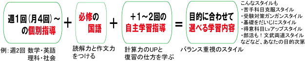 英・数・理・社から1科目(月毎に固定)を選んで学習します。国語は必修となっており、主語述語など基本からしっかりと積み重ねていきます。国語が得意だという子には応用レベルや記述、古典など対応します。また、月1回、自主学習指導を行います。日程については予約制。